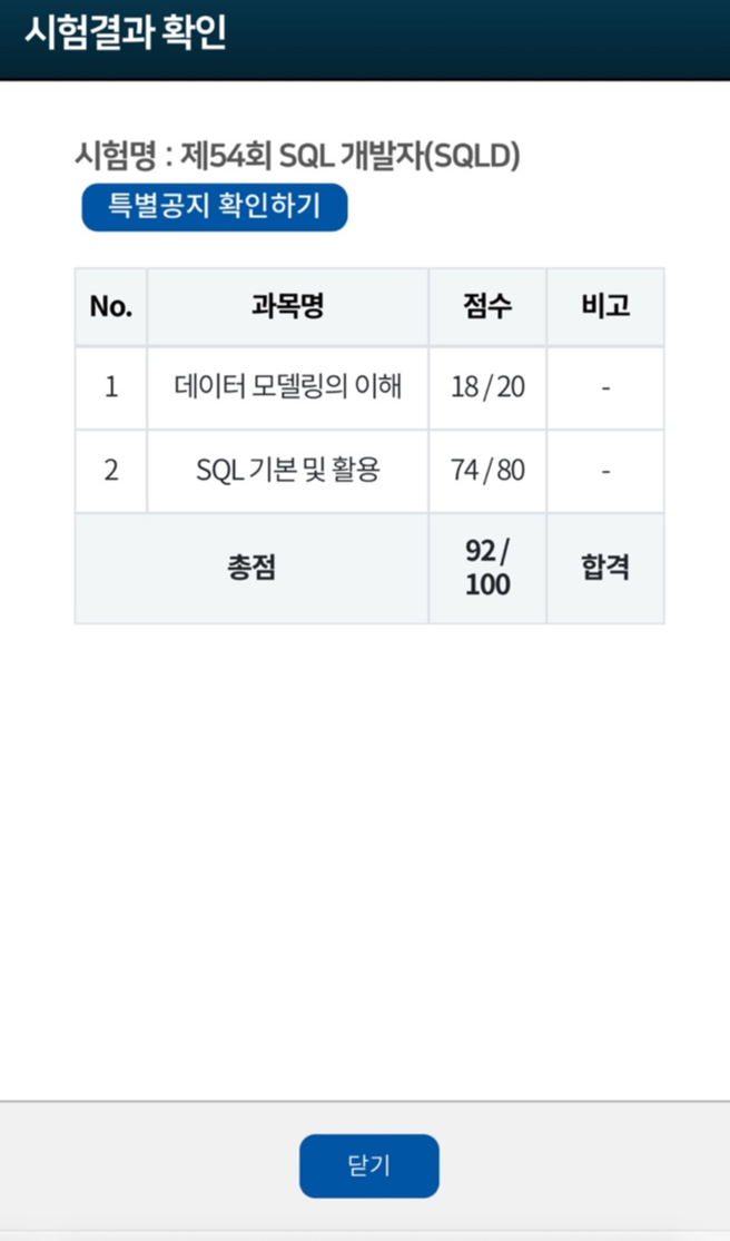 - 이번 54회 SQLD시험은 과목 1에서 헷갈리는 문제들이 꽤 있었다. 특히 바커 표기법과 IE 표기법을 자세히 공부하지 않았는데 관련 문제가 2문제나 있어서 당황했다. 과목 1도 단순 암기 위주의 문제보다는 핵심 개념을 이해하고 있어야 풀 수 있는 문제들이라고 느꼈다.
