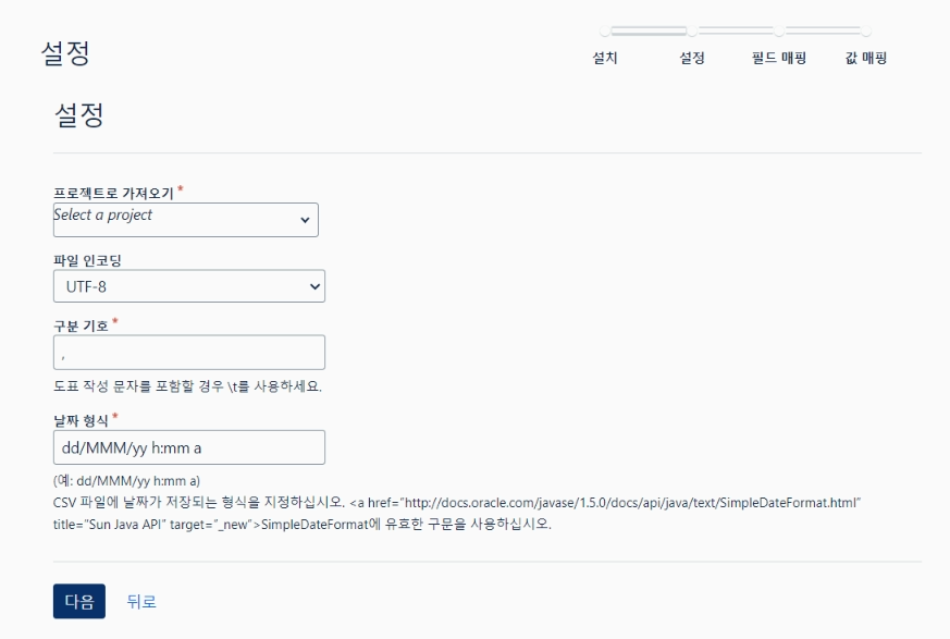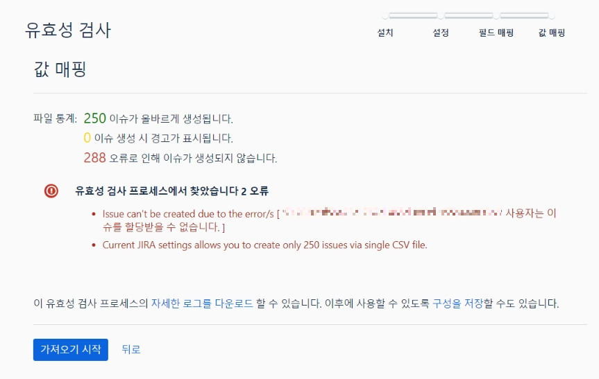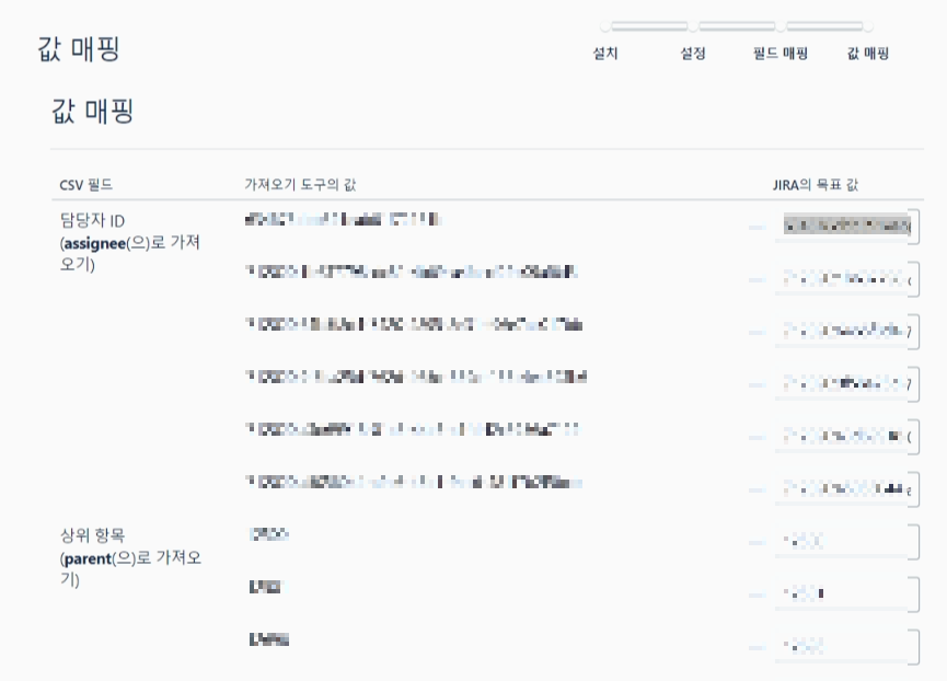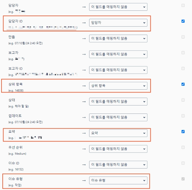 내 경우, 담당자 ID, 상위항목, 요약, 이슈 유형 4가지를 매핑하였고, 필드값 매핑에 체크를 하였다.
