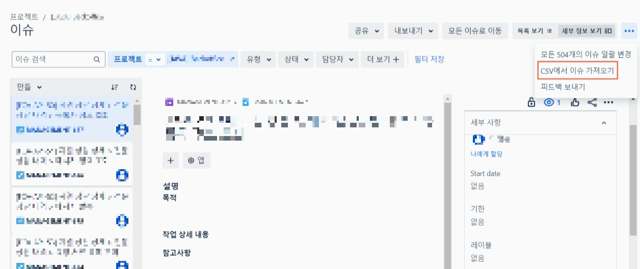 JIRA의 [이슈] 탭에서 '···' 을 누른 후, 'CSV에서 이슈 가져오기'를 선택하여 위에서 저장한 csv 파일을 선택한다.
