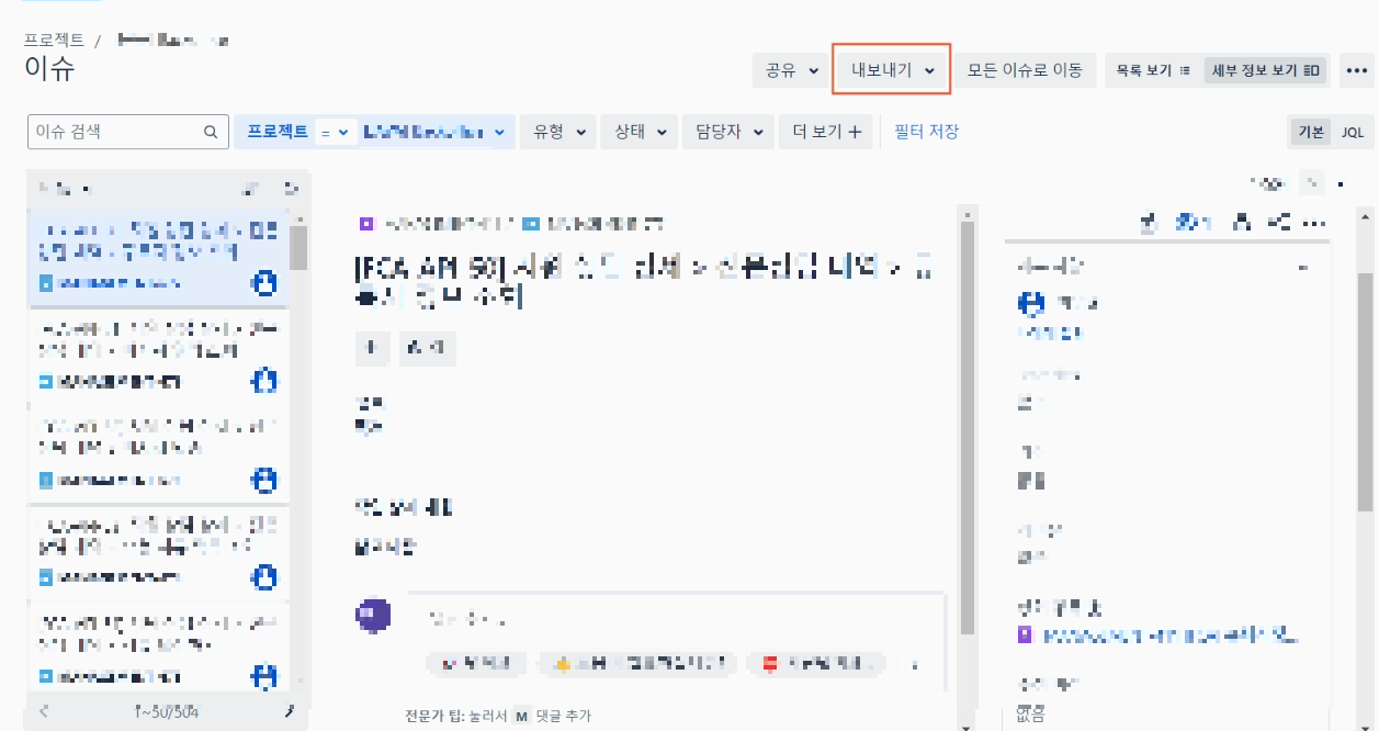 먼저, 이슈 일괄 등록을 할 때 기존에 프로젝트에 등록된 이슈들을 이용할 것이 때문에 이슈 탭에서 내보내기를 눌러 csv 파일을 내려받는다.