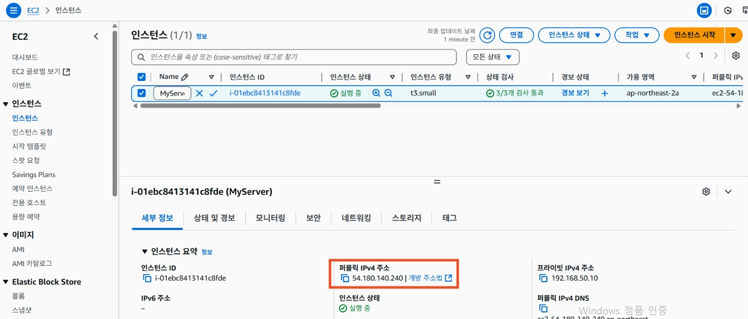 6. EC2에 들어가서 인스턴스를 클릭하면, “MyServer”라는 이름의 인스턴스가 있고, 이 서버를 클릭하면 퍼블릭 IP 주소가 뜬다. 이 주소를 복사하고, 이 주소를 통해 ssh에 접속한다.
