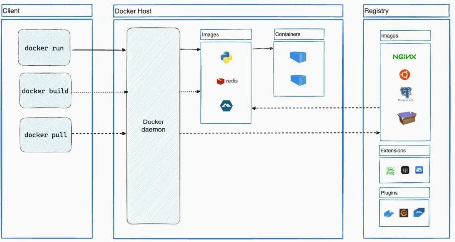 - 도커는 클라이언트(Client), 도커 호스트(Docker Host), 레지스트리(Registry) 3가지로 분류가 된다.