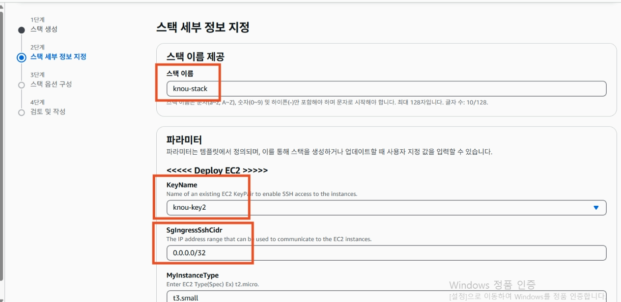 SgIngressSshCidr 에는 위에서 확인한 내 공인 IP주소를 입력하고 /32라고 입력한다.