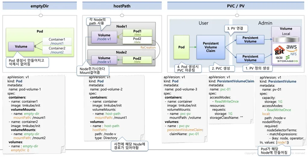 - 이 때, Pod 와 PV 를 연결하는 작업이 PVC(PersistentVolumeClaim)