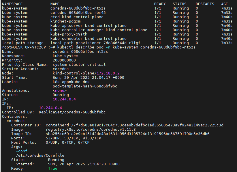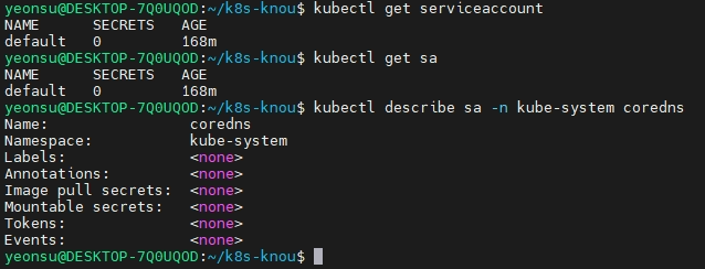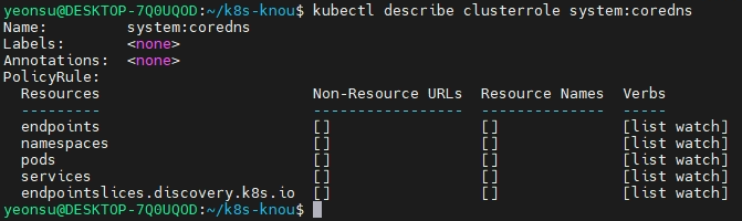 - endpoints, namespaces, pods, services, endpointslices라는 resource에 대하여 list, watch 권한을 가지고 있다.