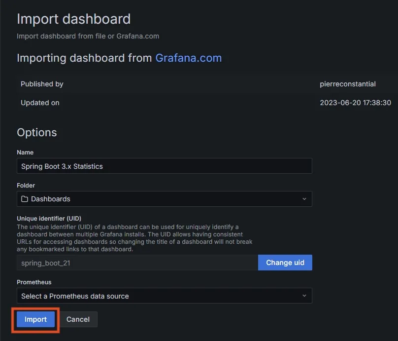 그 후 나오는 화면에서 Prometheus 부분에서 위에서 설정한 data source인 prometheus를 선택하고, import를 클릭한다.