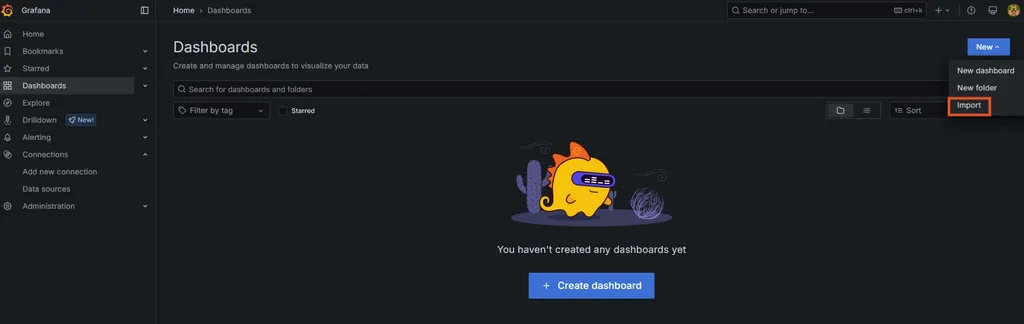 Grafana의 Dashboards 탭에서 New > import를 클릭한다.