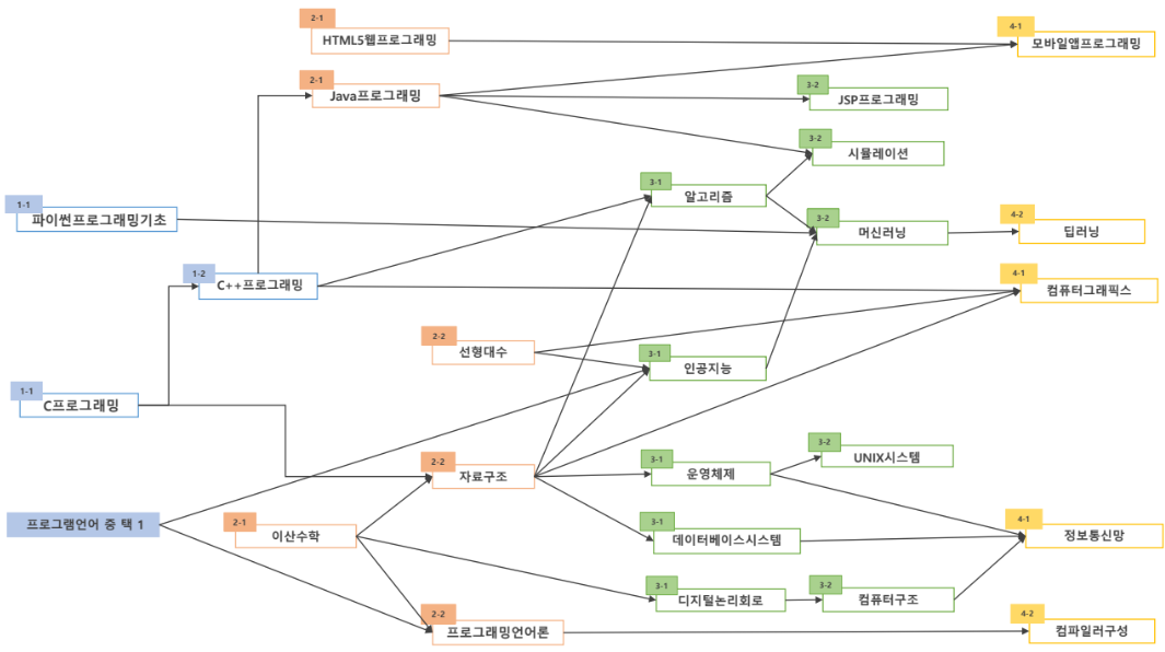 수강신청은 위의 선행 교과목표를 참고하였다. 나는 3학년 1학기에 편입하여 총 4학기를 다니므로, 3학년 두 학기 동안은 1,2학년 과목 위주로, 4학년 두 학기 동안은 3,4학년 과목 위주로 들으면 되겠다는 생각도 있었다. 또한 추후 듣고 싶은 과목의 선행 과목인지 등을 고려하였다. 예를 들어 C프로그래밍은 거의 모든 과목의 선행과목이 되기에 반드시 들어야 한다는 생각이 들었다. 그리고 자료구조는 알고리즘, 운영체제, 데이터베이스시스템 등 상당히 많은 핵심 과목들의 선행과목이 되는데, 자료구조를 듣기 위한 선행과목인 이산수학이 1학기 과목이므로 이것도 반드시 들어야 했다.