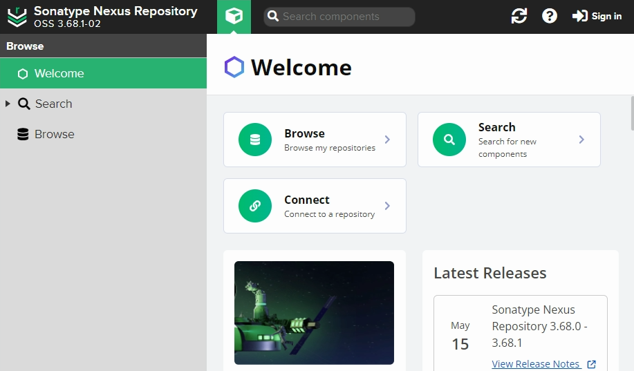 웹브라우저에서 Nexus3 UI에 접근하면 초기 설정을 진행할 수 있다.