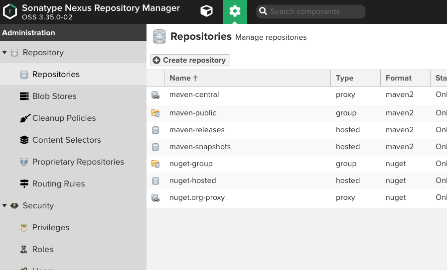 - 상단 메뉴의 톱니바퀴를 클릭하고, Repositories 메뉴를 선택한 뒤 Create repository 버튼을 눌러 리포지토리를 생성한다.